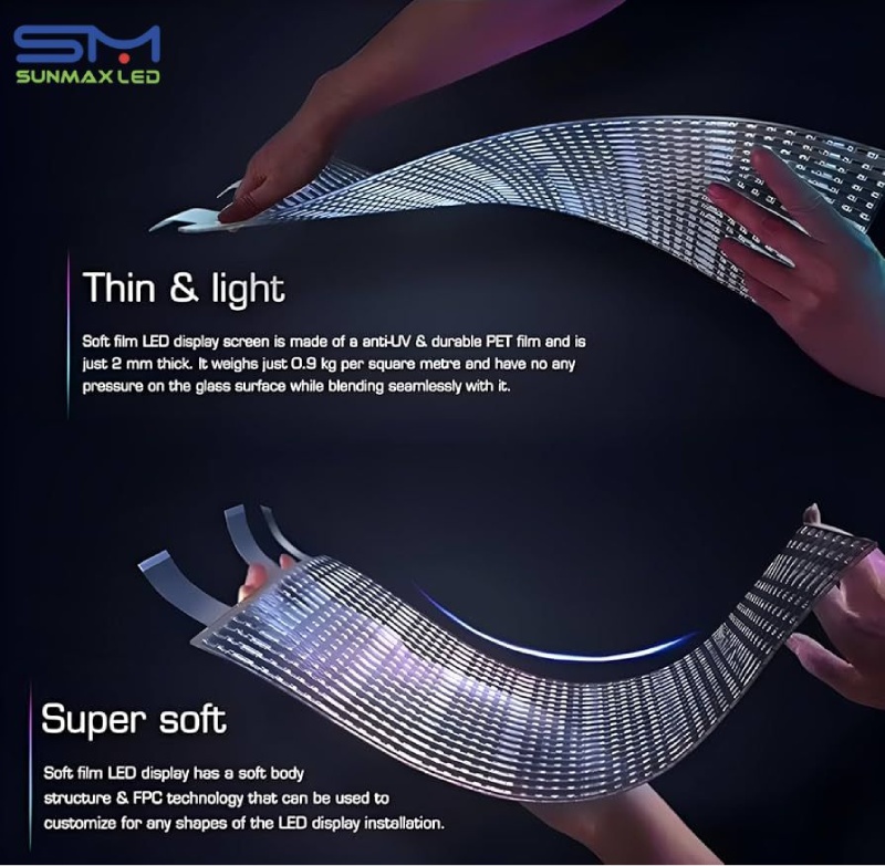 Màn hình có khả năng uốn cong theo mọi hướng, phù hợp với tất cả các hình dáng bề mặt. Điều này cho phép ứng dụng cao trên các bề mặt kính cong và những bề mặt kính mỹ thuật có tạo hình đặc biệt.