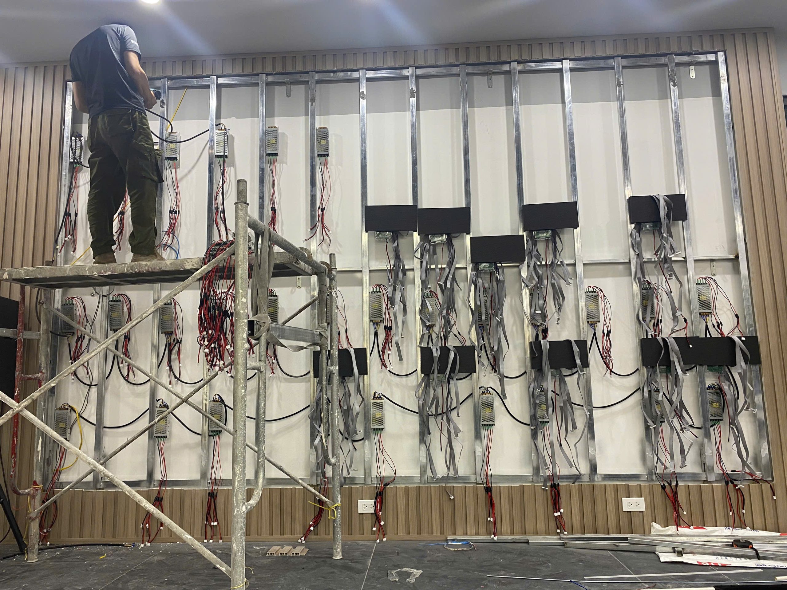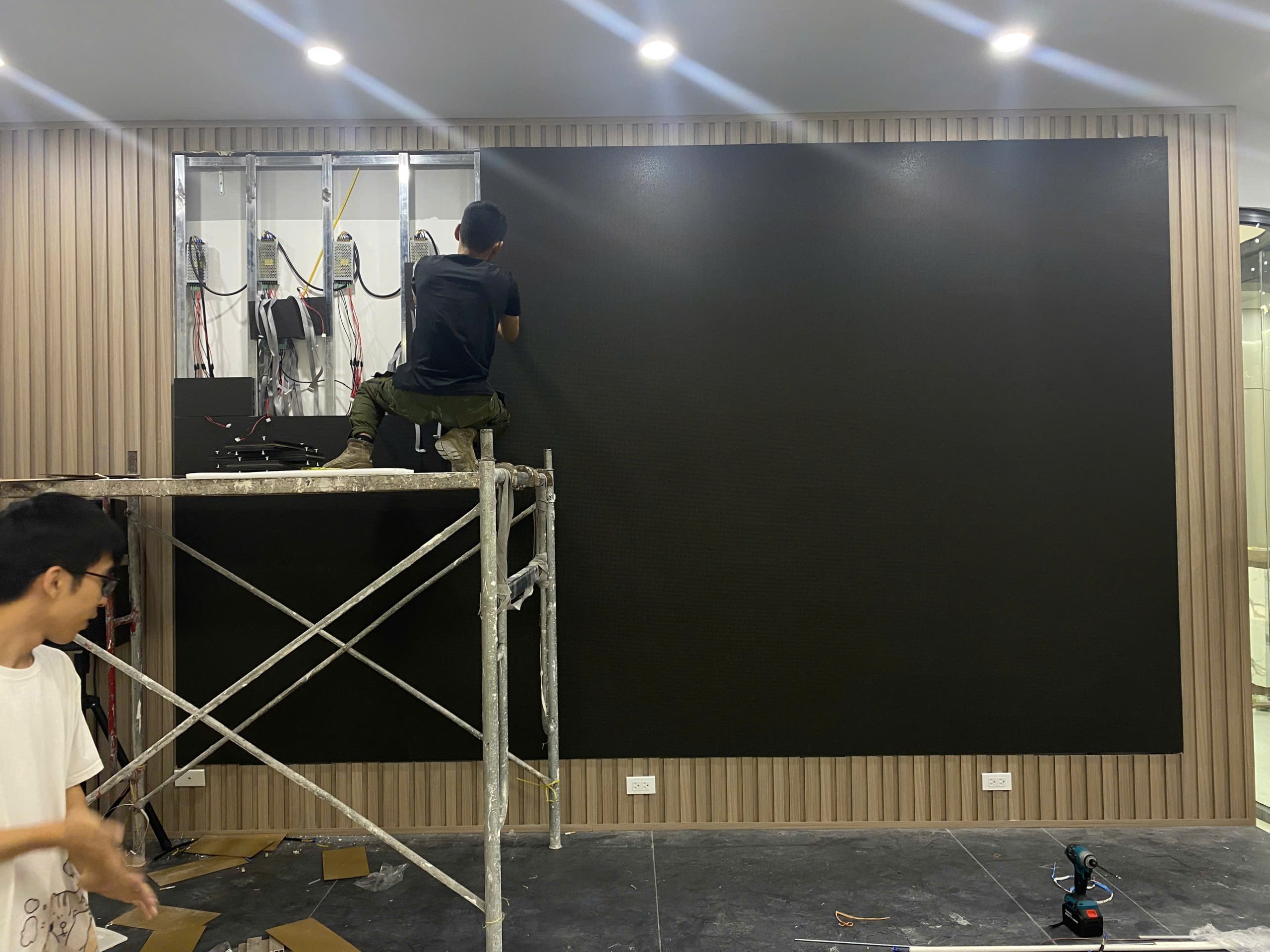 Chuẩn bị thiết bị và khung giá đỡ: Gia công khung thép tại xưởng (chiều dày 2-3mm, chịu lực >500kg), kiểm tra từng module LED bằng phần mềm chuyên dụng để đảm bảo không có pixel chết. Linh kiện được vận chuyển an toàn bằng xe chuyên dụng.