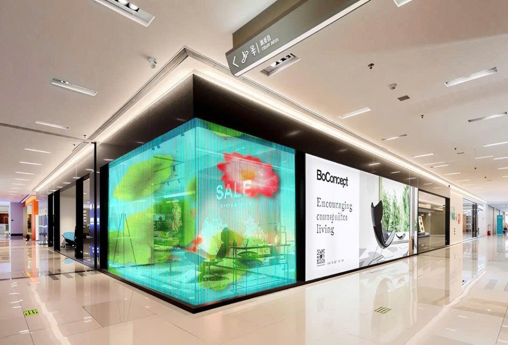 • Showroom bán lẻ và cửa hàng Flagship: Các thương hiệu thời trang, trang sức, ô tô sử dụng màn hình sau lớp kính mặt tiền để trình chiếu bộ sưu tập mới. Sản phẩm bên trong cửa hàng vẫn hiển hiện lấp ló phía sau các video 3D, tạo sự tò mò kích thích khách hàng bước vào.