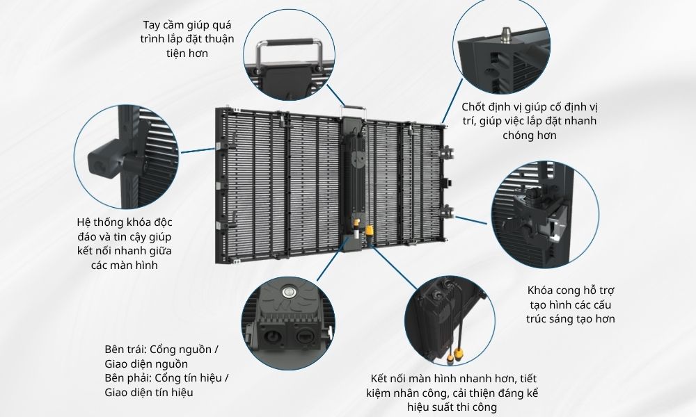 Vát góc 45° & Khóa cong (Arc Lock): Cho phép ghép nối vuông góc 90° hoàn hảo và bẻ cong mượt mà. Đáp ứng mọi hình thái sân khấu phức tạp nhất: phẳng, cong, uốn lượn hay các khối lập phương 3D lơ lửng.